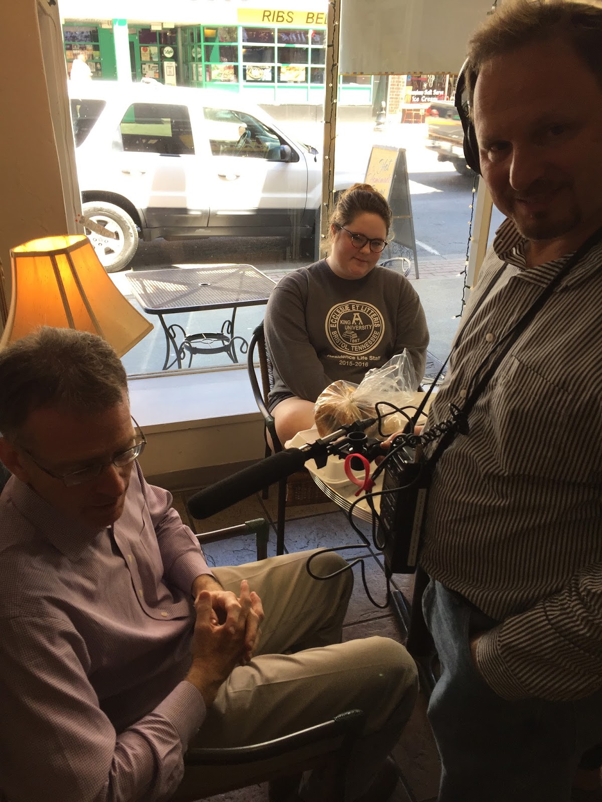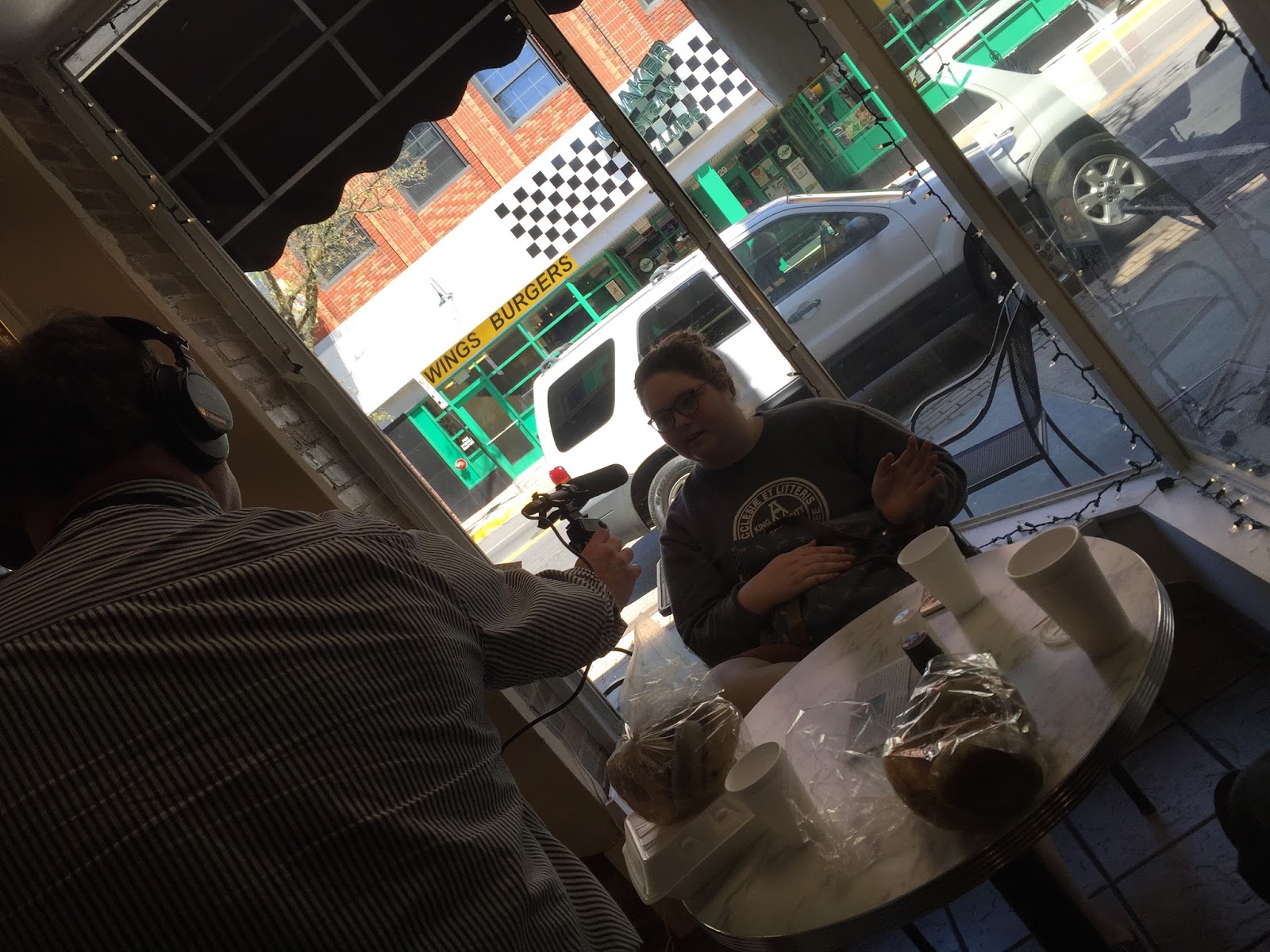 We went out for a celebratory bagel for lunch. And when I returned to the table, I see a large microphone in front of Victoria and she is being interviewed about politics and the presidential election by a guy named Steve, who turns out to be one of the hosts of the most listened to news radio program in America, “The Morning Edition” on NPR.