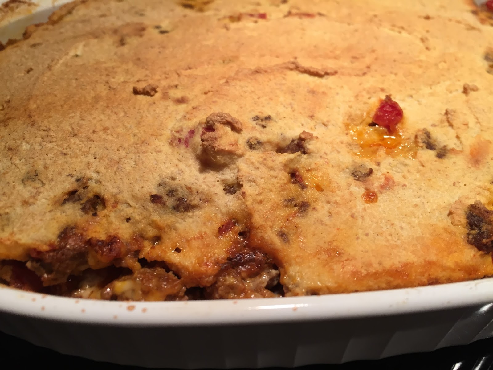 The Salesman bragged to our friends at a dinner party last week about how good my cornbread is,  and it got me to thinking about a THM version of cornbread.  Granted, this cornbread is atop a casserole; but it was pretty good.