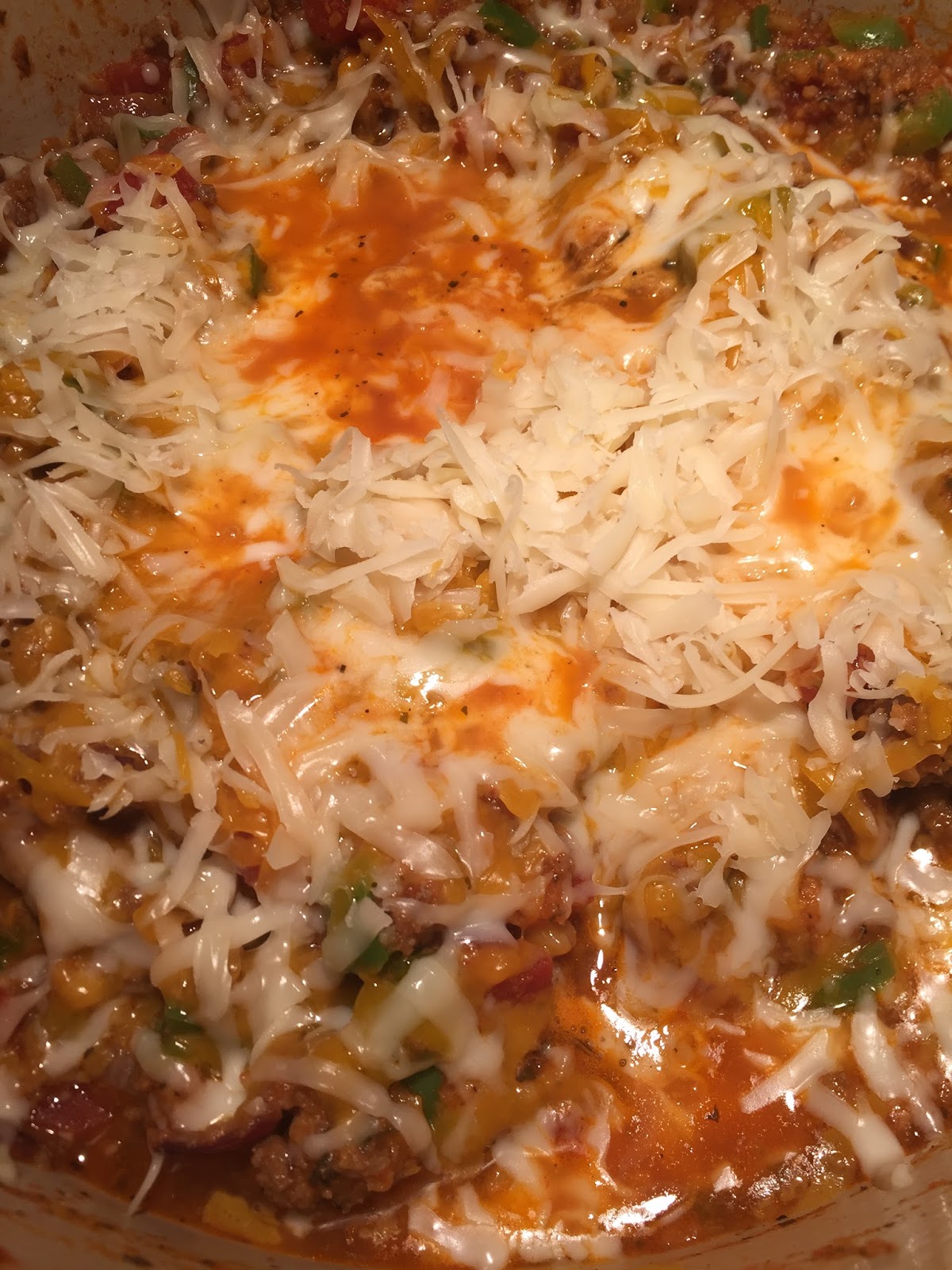 The Salesman’s father had sent us a bag of fresh peppers from his garden and we have been eating them like they were candy. Seriously, so very tasty. When I came across this recipe, I knew I’d use the father-in-laws garden gold for this recipe that called for 3 to 4 peppers. I used four. This recipe calls for either rice or cauliflower rice and I used the cauliflower rice. I followed the recipe closely except for the final ingredient which was the topping of cheese: the recipe called for cheddar and I used half mozzarella and half cheddar. The picture in the cookbook looked like a white cheese to me. I realize my pictures look like mostly cheese; but there are some yummy veggies tucked underneath: peppers, cauliflower, onions and tomatoes.