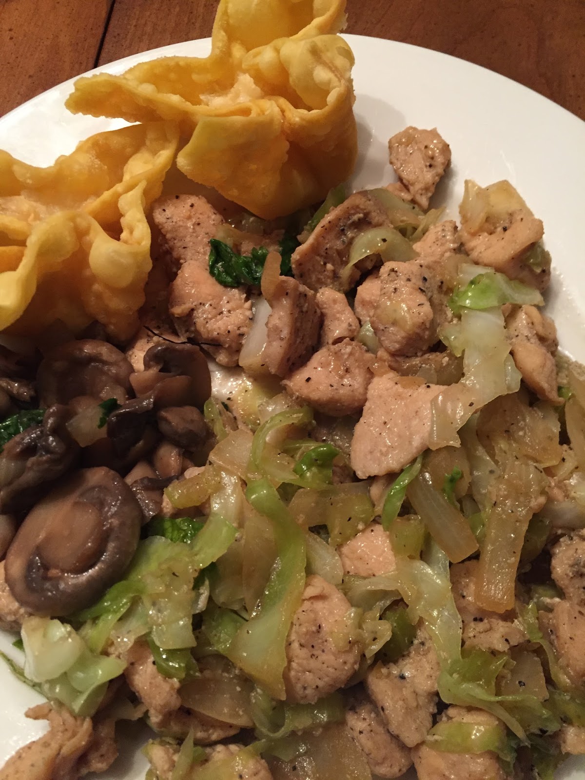 Black Pepper Chicken is on page 68 of the Speedy Skillet Meals chapter. It can be made as an S (satisfying), E (energizing), or FP (fuel pull) meal. I made it as a FP. I did make rice as an optional side dish – it was not done when I plated the meal for pictures. I did not eat the rice; but if I had, it would have been an E meal. The rice was done about ten minutes after we sat down to eat! Yes, and it was not very good according to my dear family – just being real. I struggle with rice, not sure why; but, I do. I served sautéed mushrooms and zucchini and onions as side dishes. And Victoria went to a favorite Asian restaurant in town and brought home an order and a half of crab rangoon. YUM. They are not THM; but they went so well with this meal.