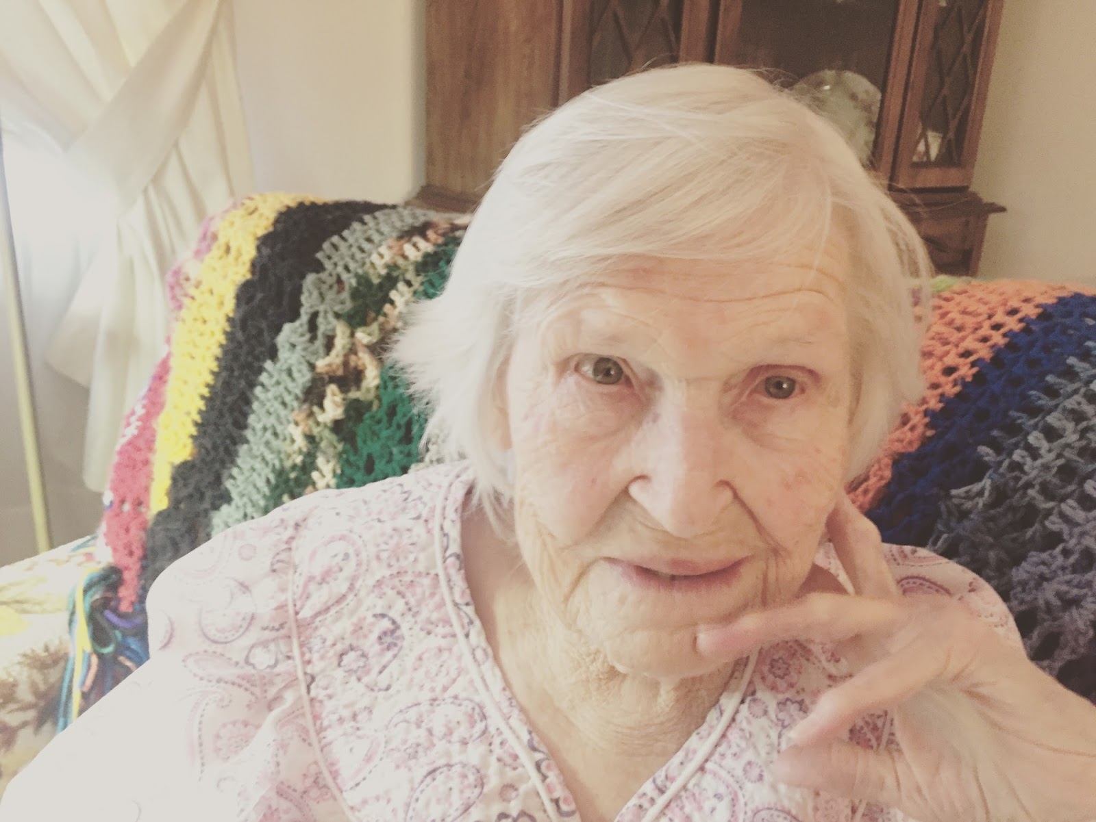 Pictured is my grandmother from a visit we shared on Sunday evening. Her lovely afghan of many colors is gracing the chair she reclines in as we visit.