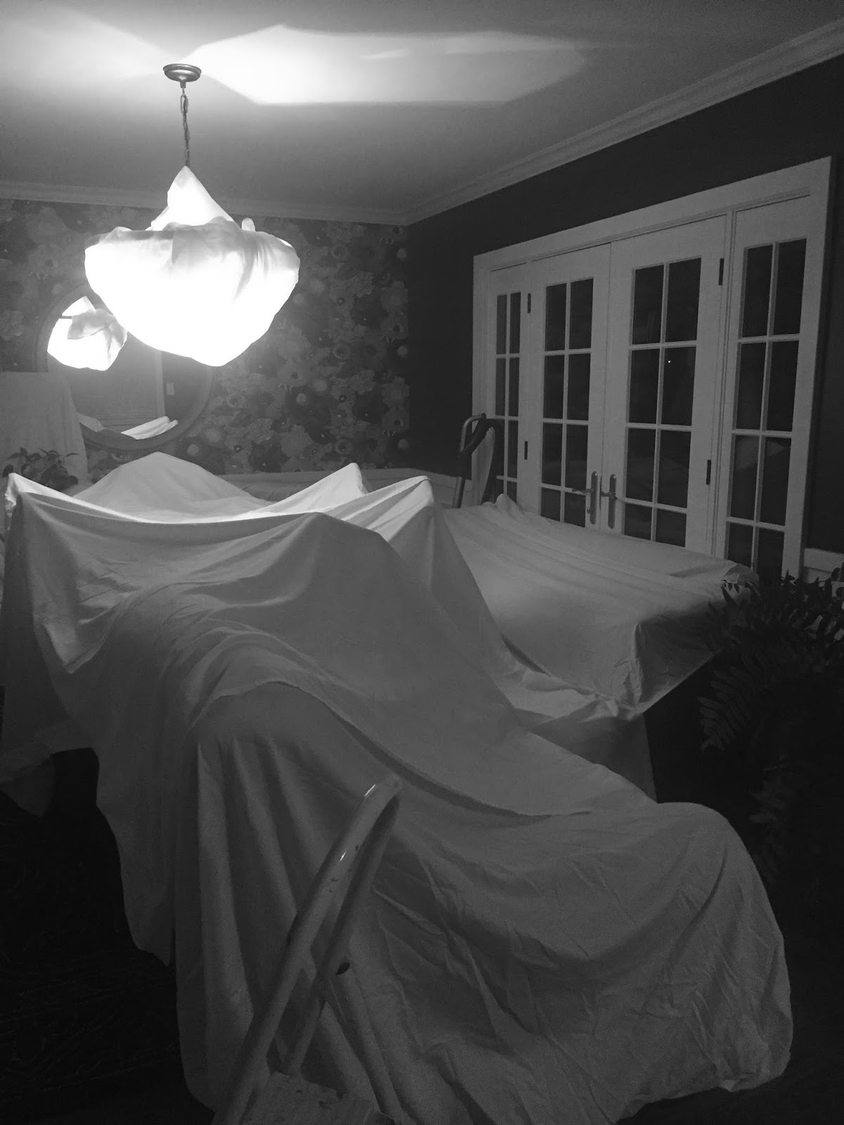 The dining room is still home to many various and sundry parts of our home now. And FYI, if you cover your chandelier with a sheet and turn the light on, your sheet may scorch from a very hot light bulb…just saying.