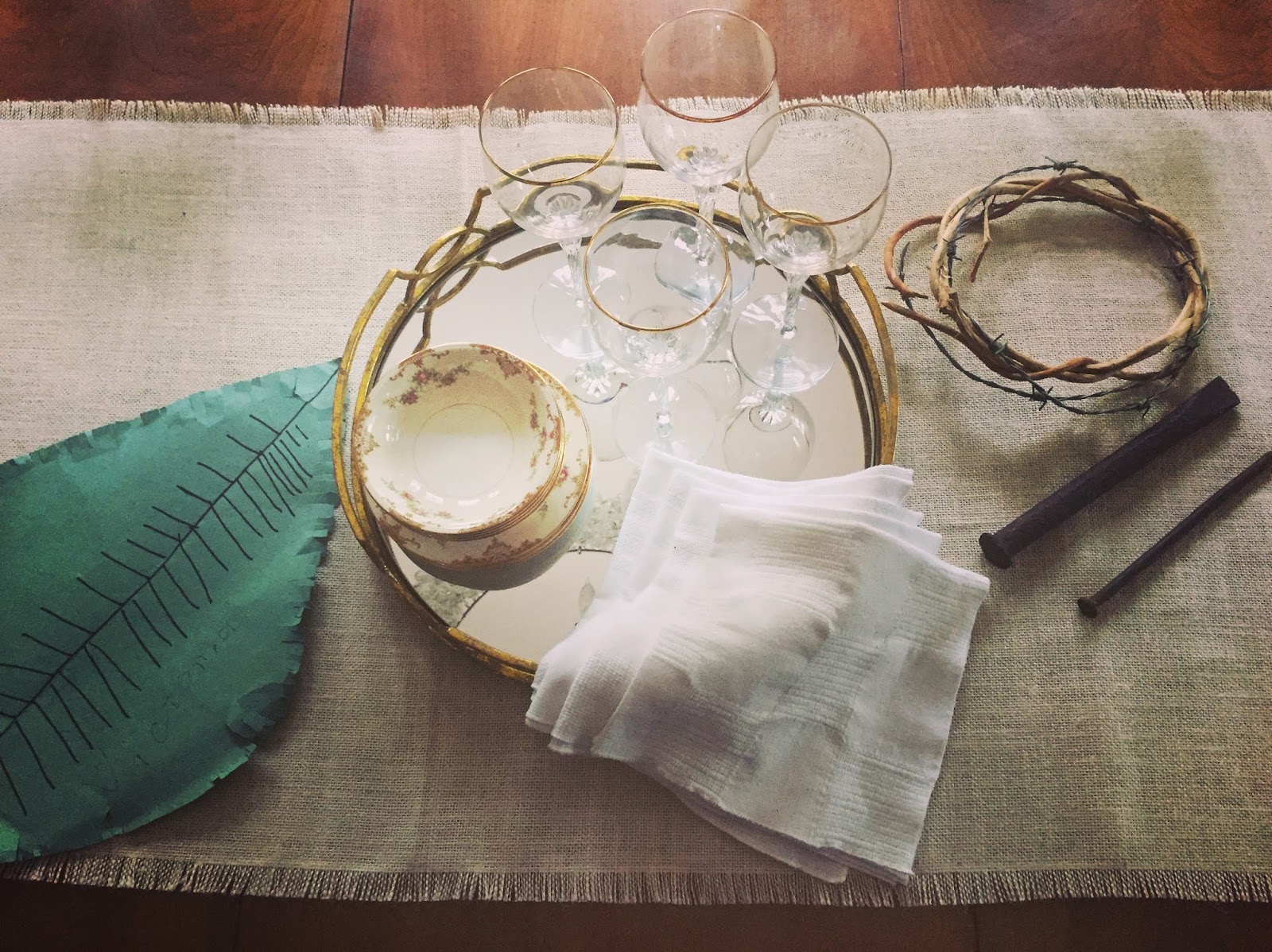 The first picture was the Good Friday table decoration at home. The palm leaf Victoria made circa 2002. The children’s artwork is, and always has been, my favorite decor! We made the crown of thorns from vines in our yard when we lived on West Fourth Avenue. The goblets were wedding gifts almost 30 years ago. I made the napkins while in college. The Aristocrat china was Grandma Bea’s and the nails and barb wire were later additions from my grandparents home.