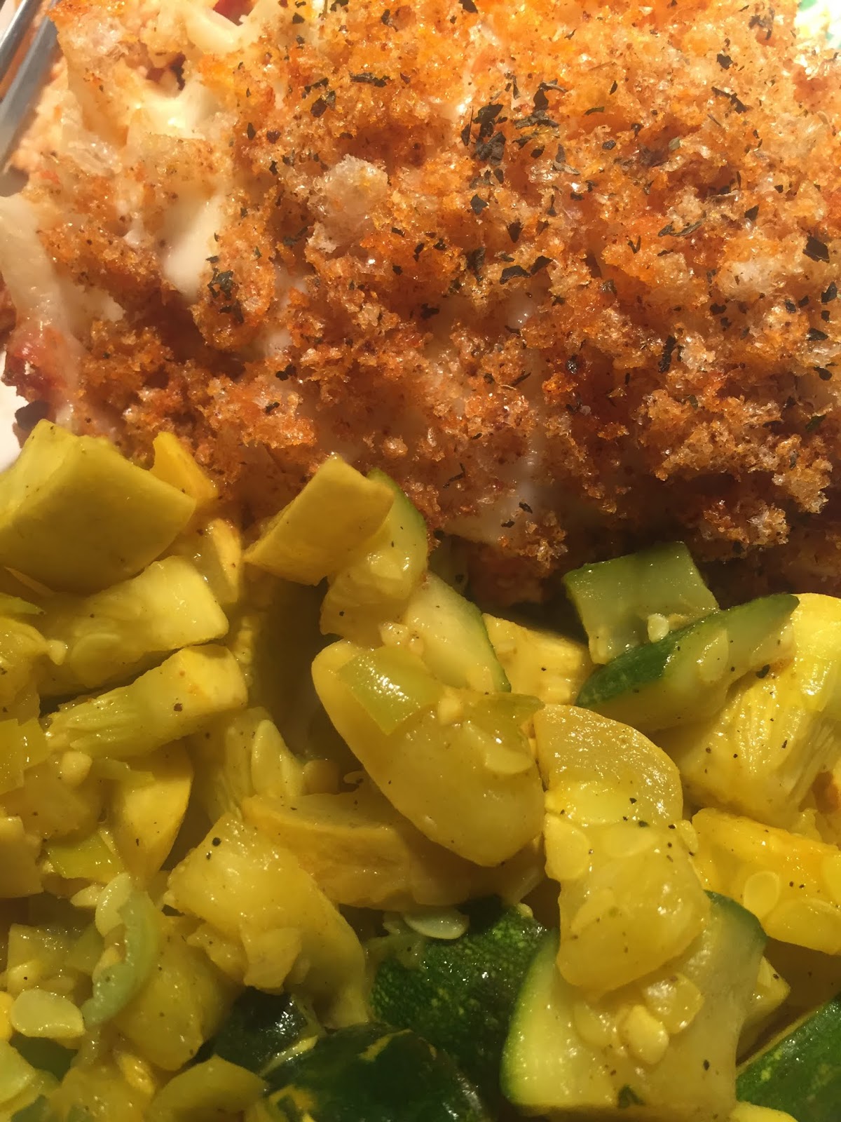And here it is hot from the oven. And you will see that only about two-thirds of the casserole is covered in the crunchy topping. The part without the topping is mine. The topping is made from pork rinds, and I don’t do pork. This pretty much sums up how the food split goes in our home. The Salesman eats about two-thirds of a dish, and I eat about one-third. The recipe called for an 8 inch pan and I already had my Trim Healthy Mama Trimtastic cake in it, so my next choice was an 8 x 12 inch pan. We each had three meals from this dish. I thought it was good! The marinara sauce and the basil were tasty to me. The Salesman did not comment. So, of course I asked, and he said it was okay…