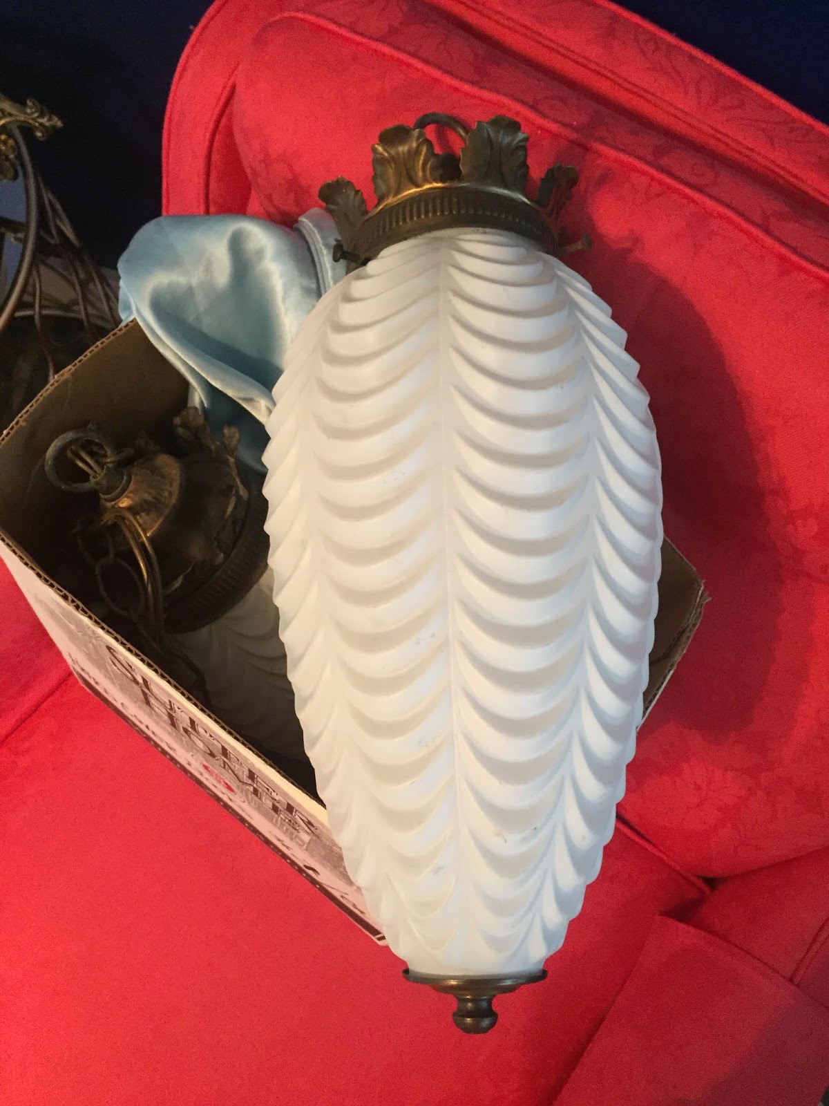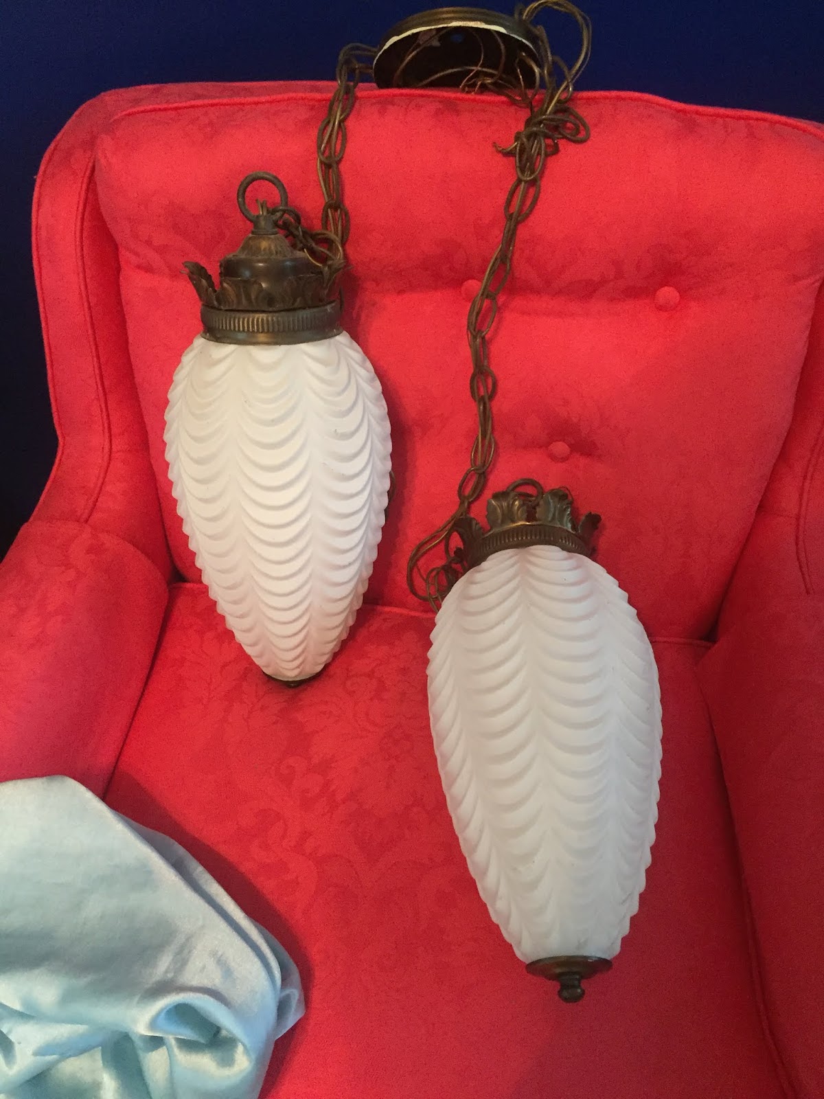 The day the shop opened, I already had an appointment; and when work was done, I headed straight for the shop. So, when I arrived, I had to constrain myself and not run in the door and go straight to the lighting area. I casually got a shopping cart, and slowly made my way back to see if they were still there! And I may, or may not, have done a happy dance when I saw the box with two vintage, white matte glass, pendant swag lamps — YES!!!
