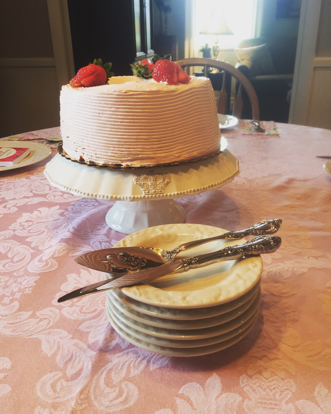 I peeked at her luncheon table, because she always sets a lovely table and noticed that the pink icing matched her tablecloth…