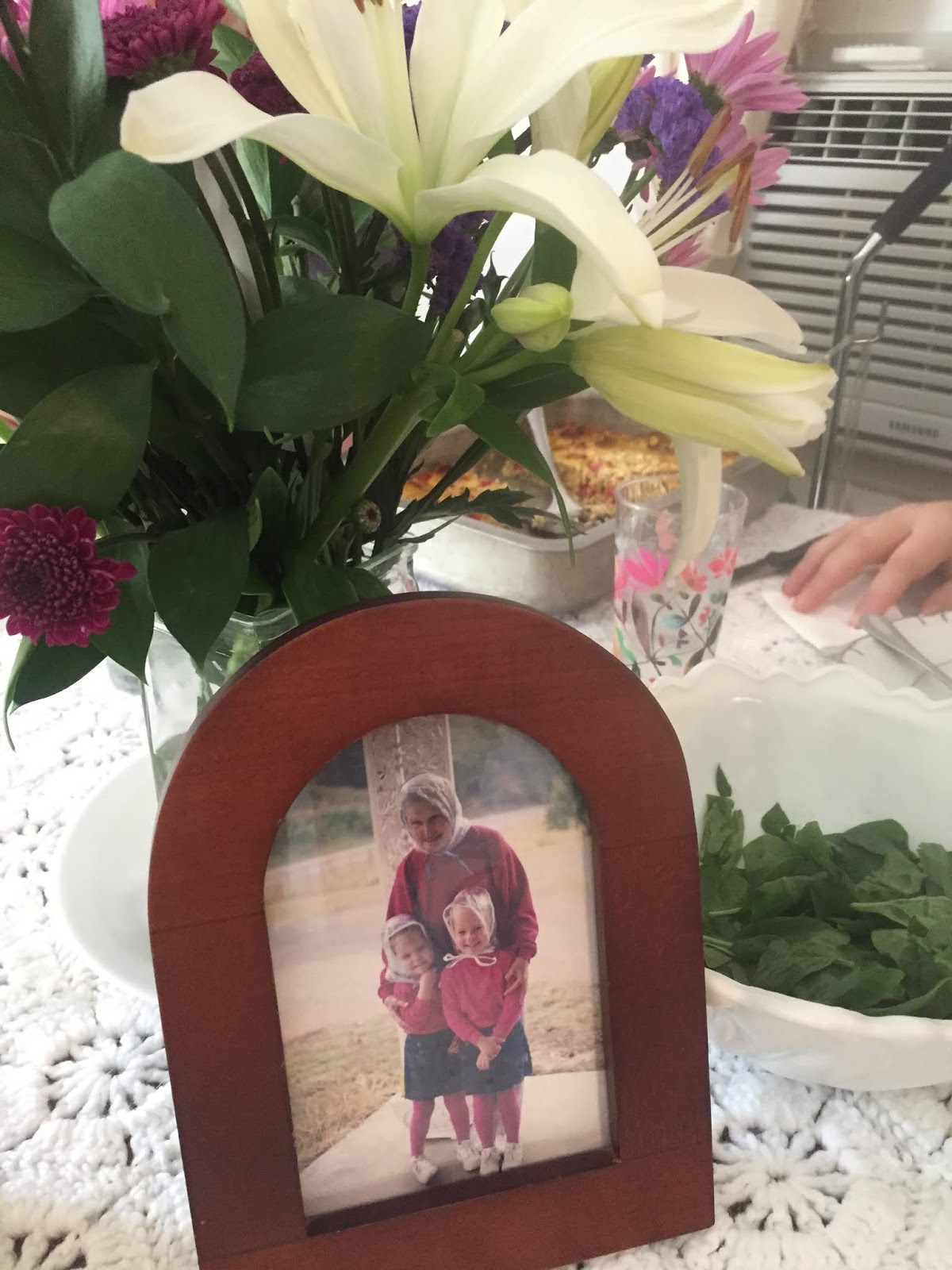 Victoria and I made a passed-down family recipe for a savory breakfast brunch into a Trim Healthy Mama dish and Victoria served it along with a fresh spinach salad with toppings galore! Salads have been one of my favorites lately, and I thought I may have gone overboard in all the toppings I brought along; but the empty containers confirmed that everyone enjoyed the salad and all of the toppings, too! Oh, the joyful memories of meals around this round table. This table is a circle of love to me. As a young girl, my little family, and both my grandparents, would sit elbow-to-elbow and talk and laugh and share life and many a meal at this table. I remember my grandpa calling me Little Girl as he handed me cottage cheese or macaroni and cheese. I remember the love felt in the hard wood chairs. I remember smiles and nods and pats and hugs. I remember the sofa and chair being covered in the very same fabric all these years. My grandma was always the one that would serve. As the years have come full circle, she now is served.
