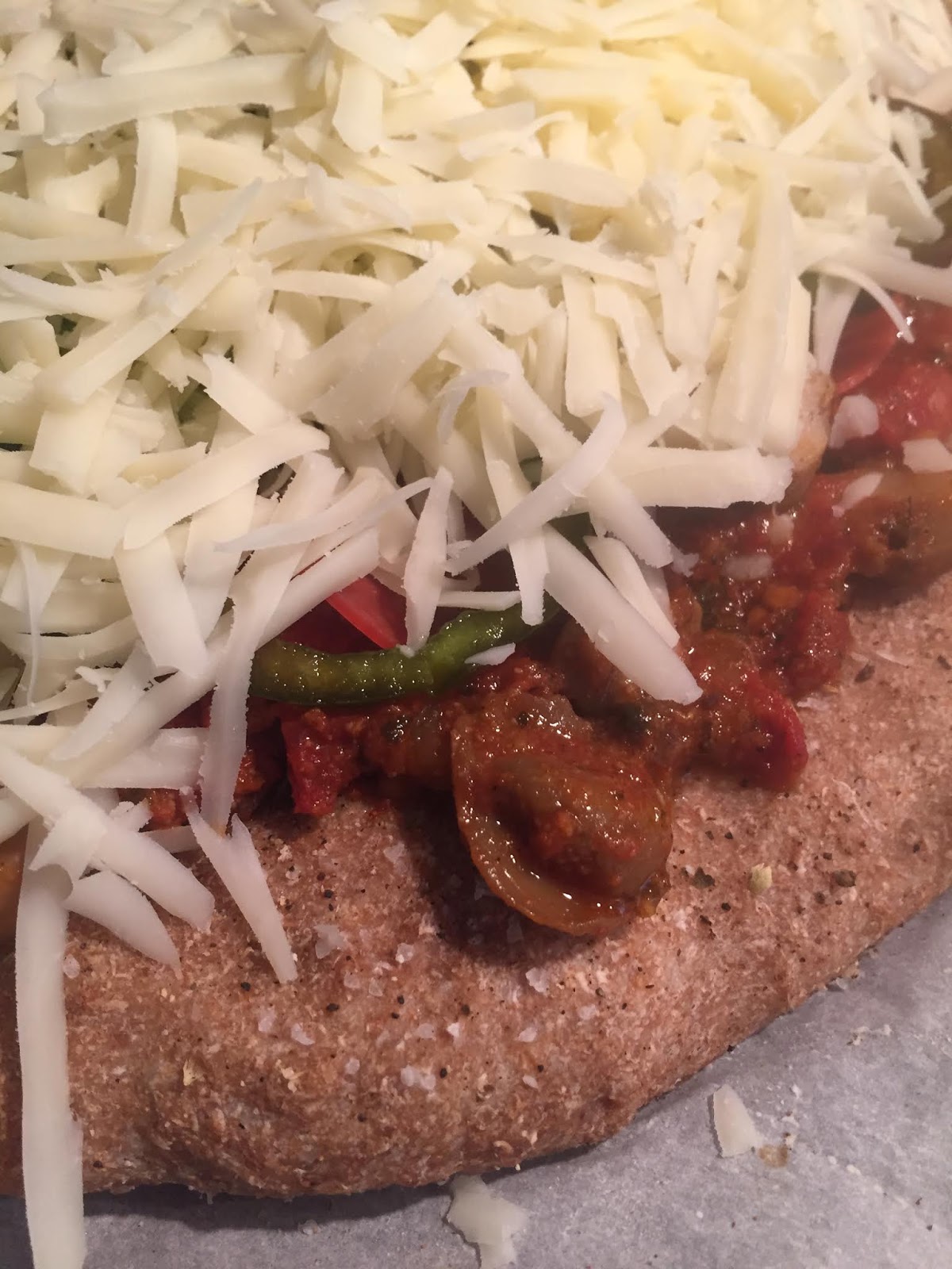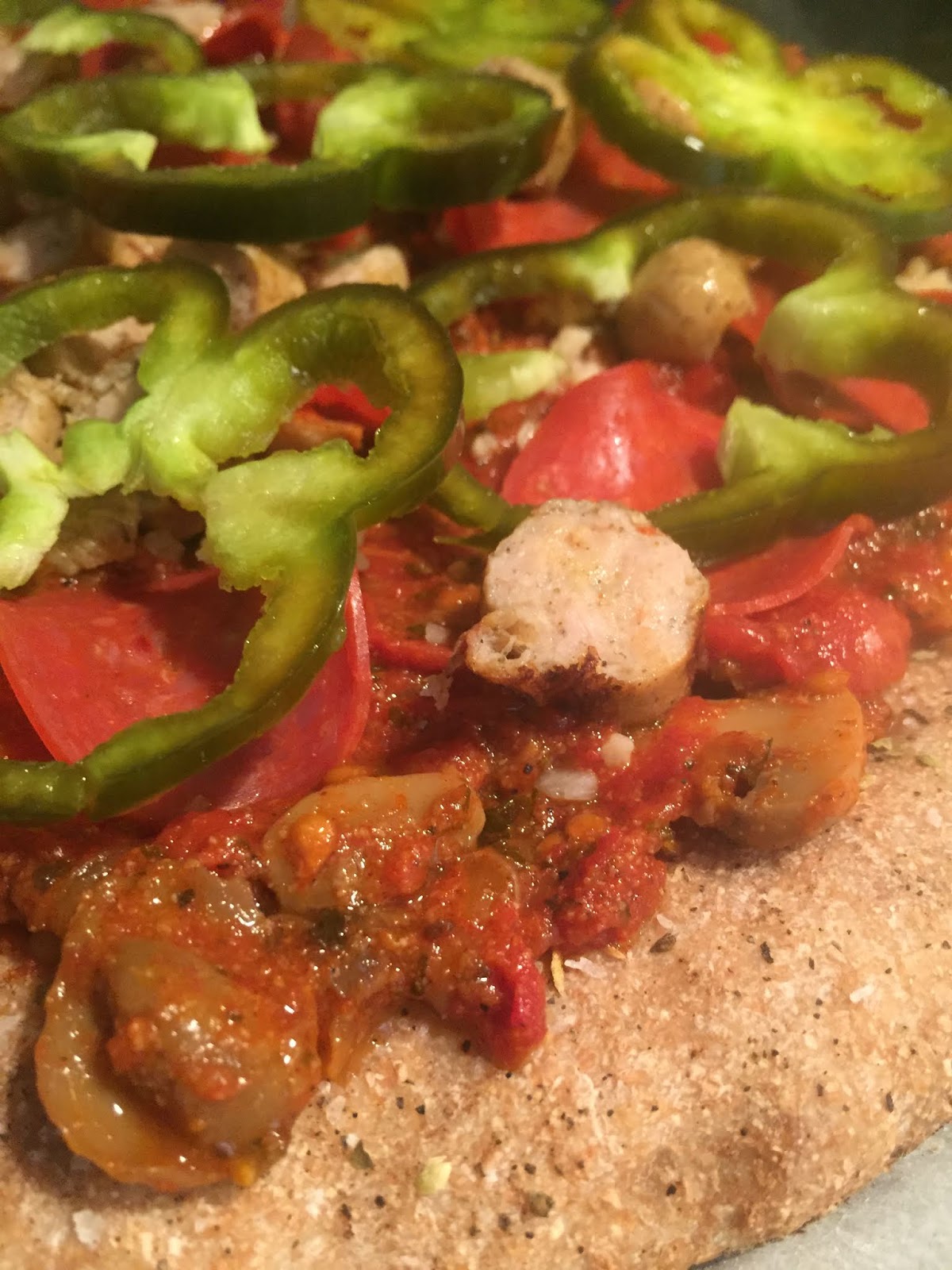 I added meat toppings because The Salesman’s favorite pizza is a meat lovers pizza. I added turkey pepperoni and chicken sausage for heart healthy options.
