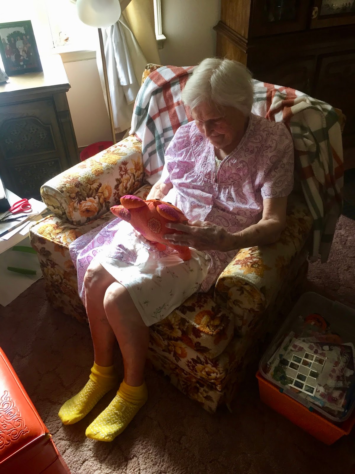 My grandmother is the most beautiful woman in the world to me.  There is such love in her most-days-aching-eyes, and in her heart the size of Texas, and in well-worn hands.  She is enjoying the detail of this bear that my dear friend *Pearl* made.