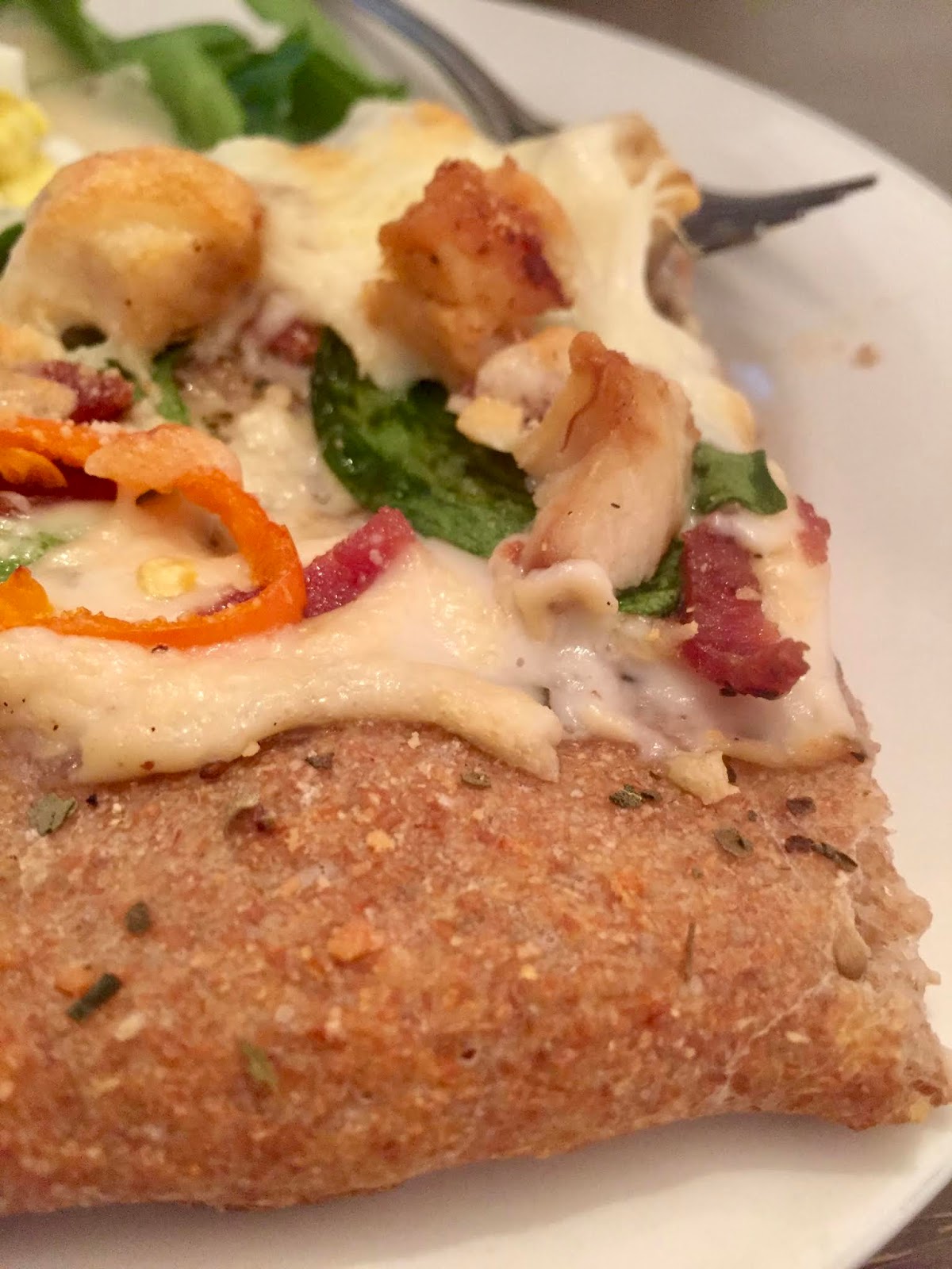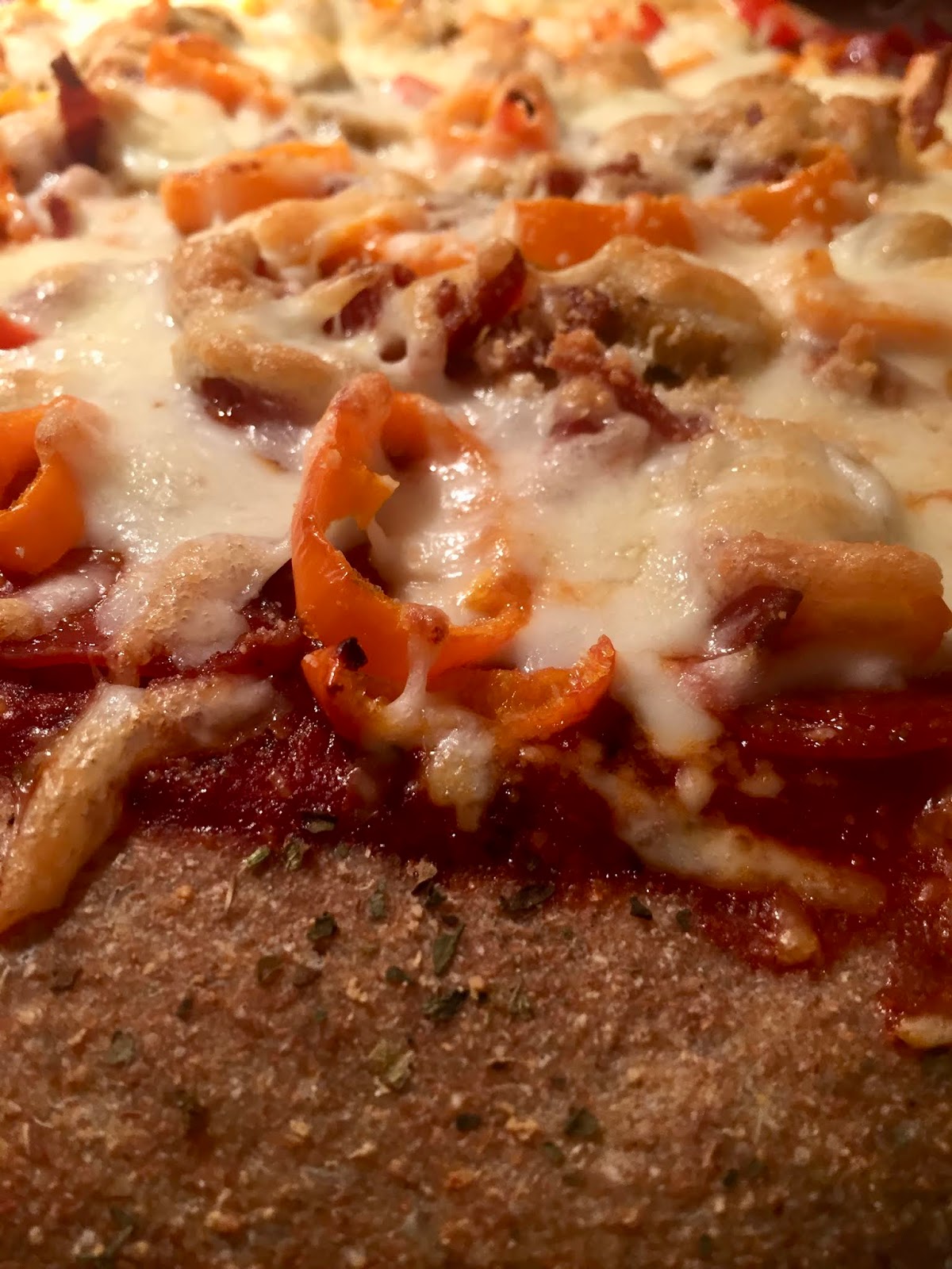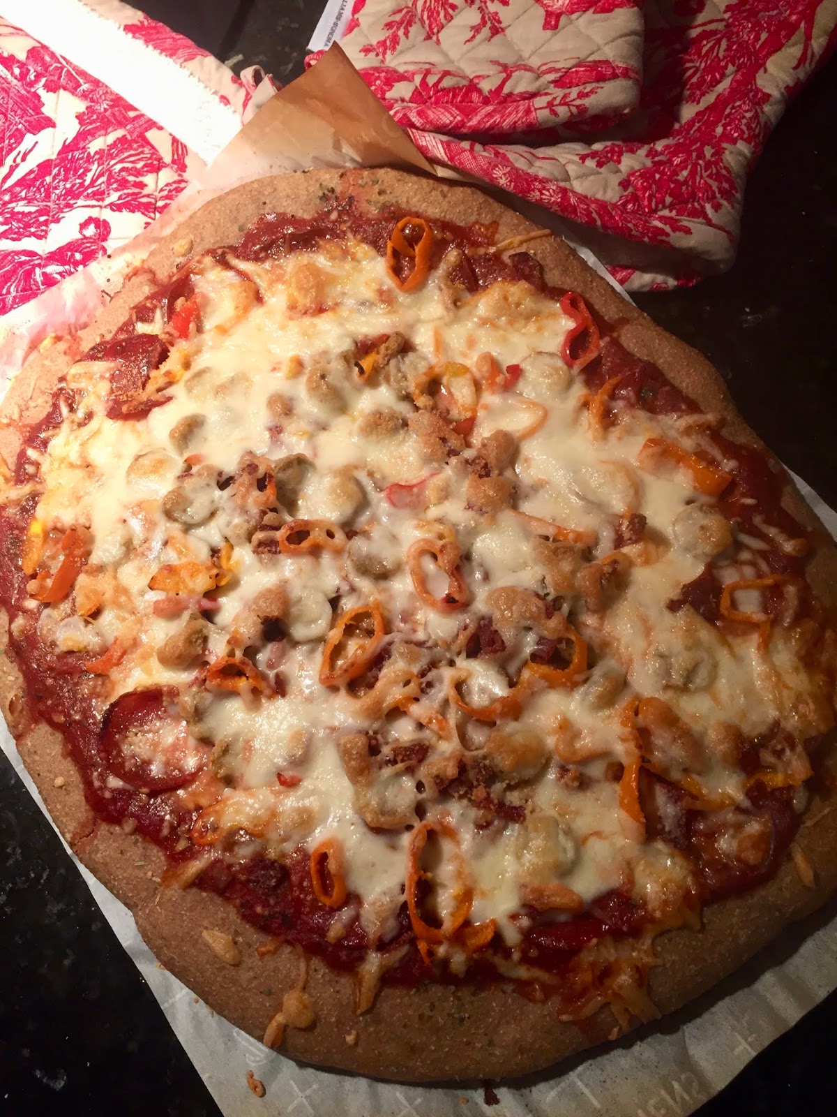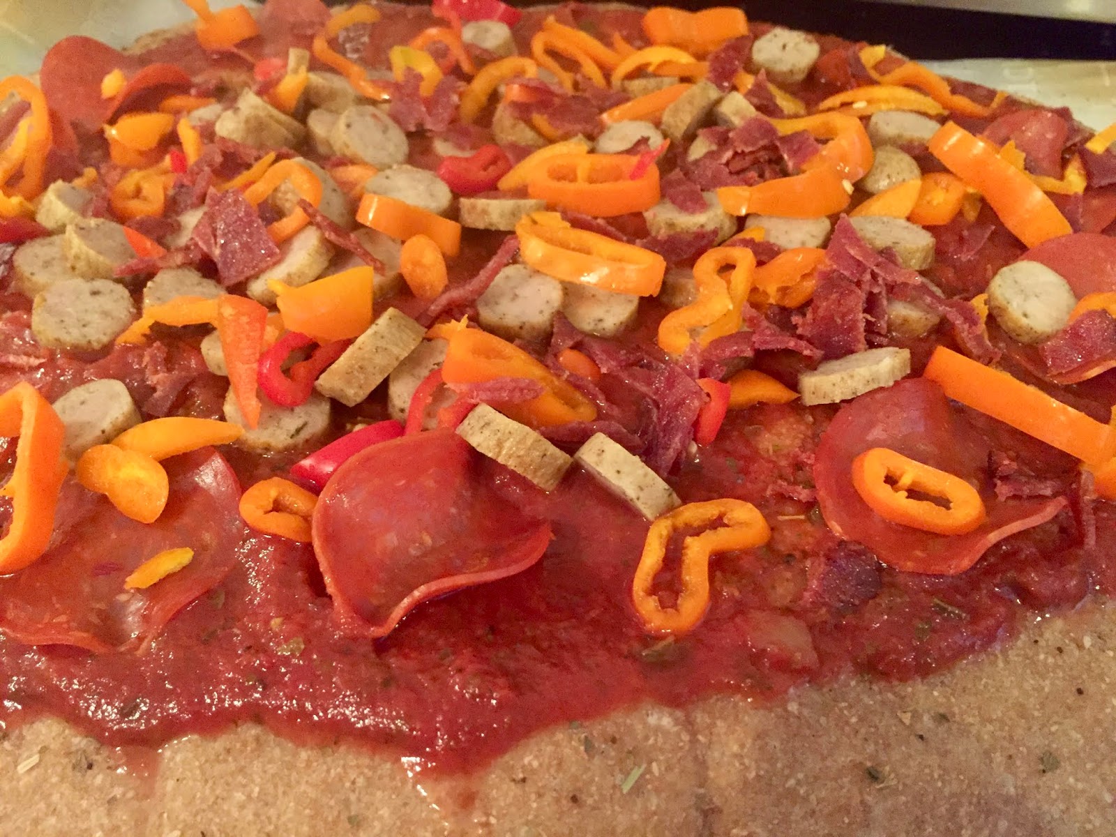 Because I forgot to thaw the sauce I’d made and stored in the freezer, I used sugar free sauce from Aldi, which was good! And I forgot to put kale or spinach on The Salesman’s pizza, so it really is a *red* pizza!