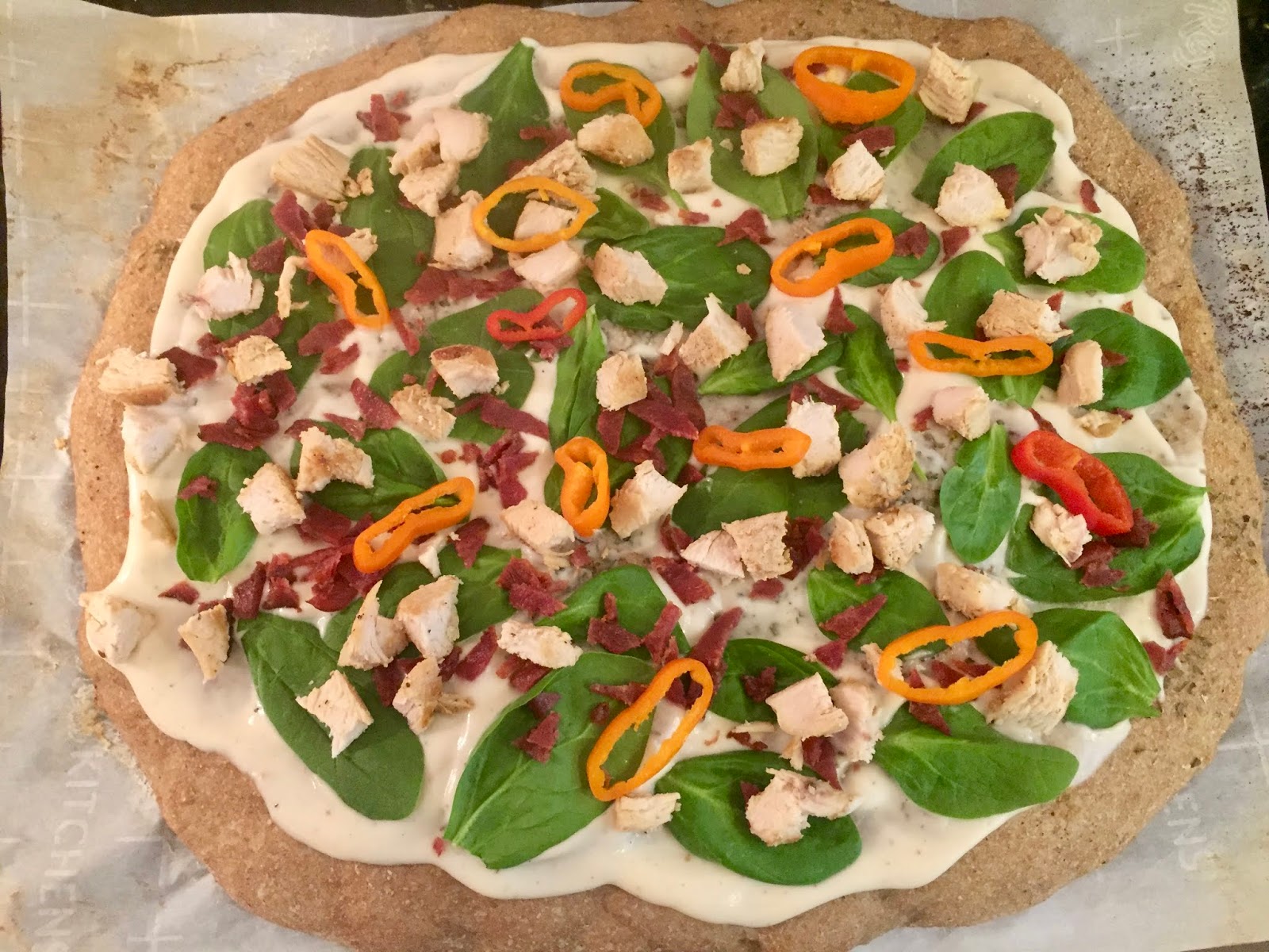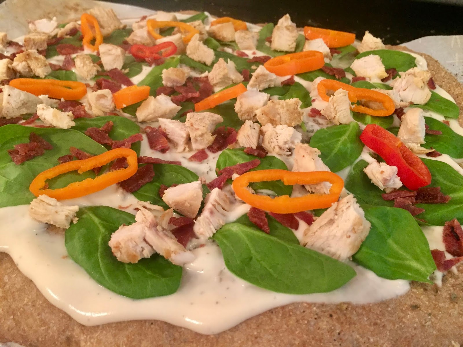 Then I started on the white pizza, which I decided would be a chicken, bacon and spinach alfredo pizza. Now, I thought I had a picture with all the listed ingredients on the plate; but, I only had a picture of what was left on the plate! I used all the spinach I had on the plate, plus some, and didn’t use all the chicken or turkey bacon. I had planned to make the alfredo sauce; but was thankful to have an Aldi jar on hand.