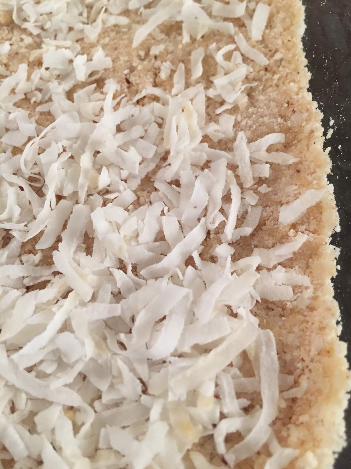Half of the mixture, I left in the pan for bars, and sprinkled the leftover coconut from rolling the balls in on the top of the bar mixture: