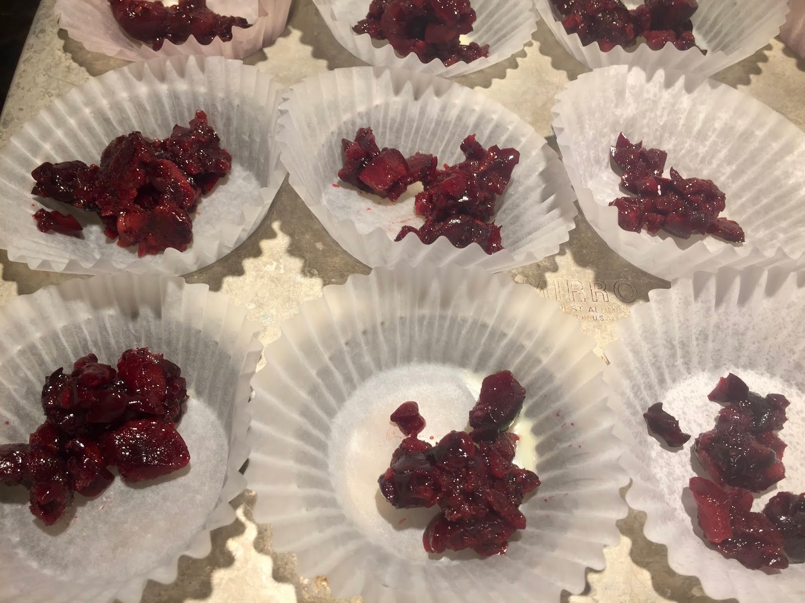 Be sure to mix your cherries thoroughly into the batter.  Don’t leave them in a clump on the center of your baking cups.  The batter was tasty too.