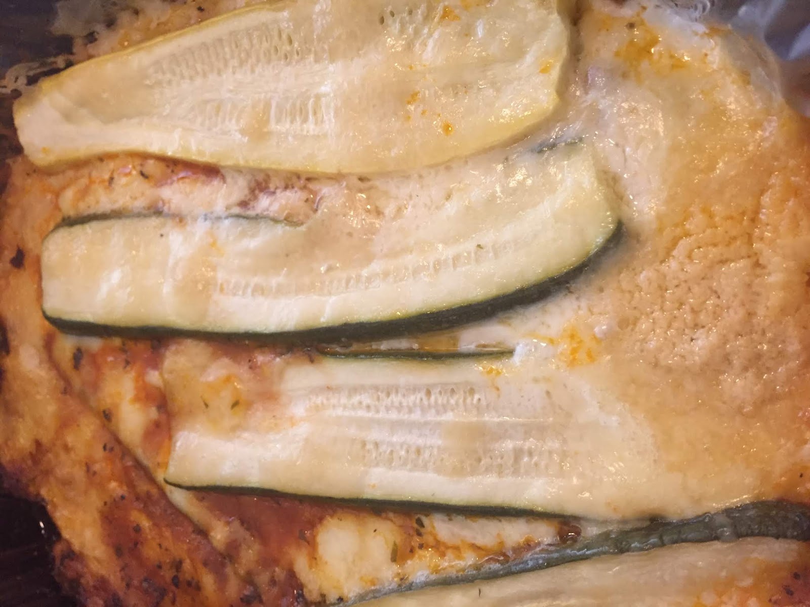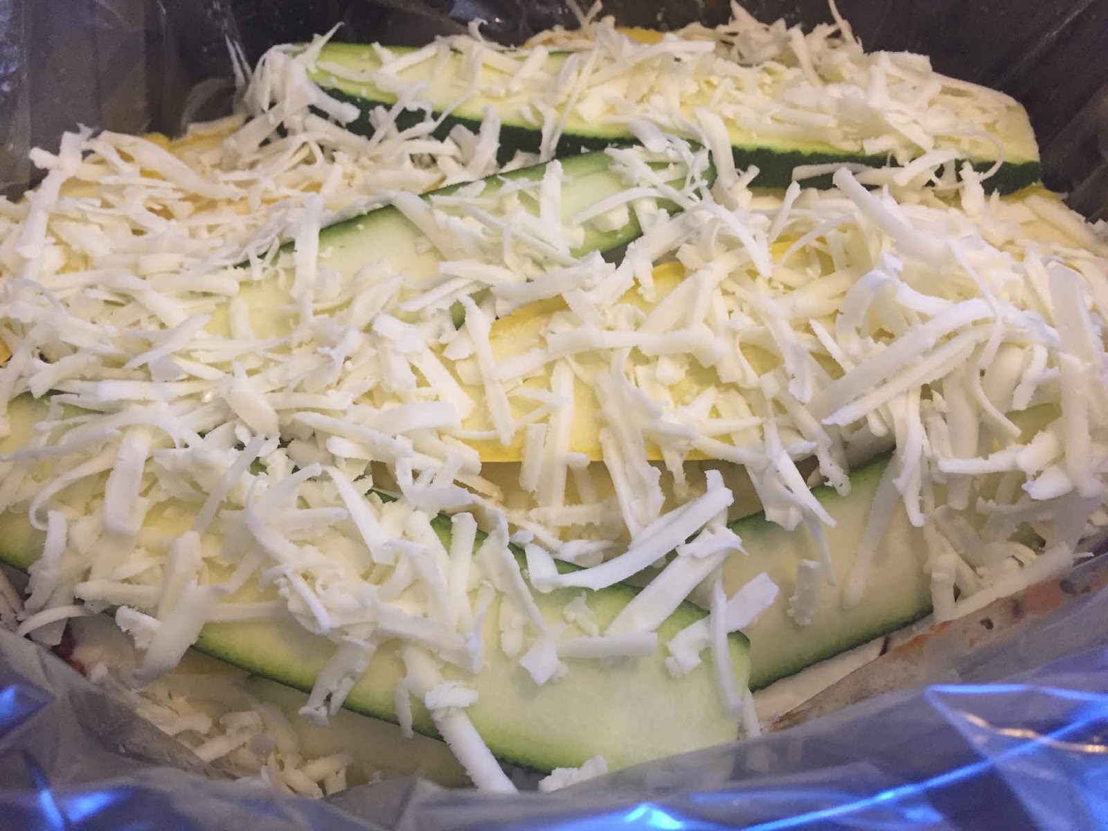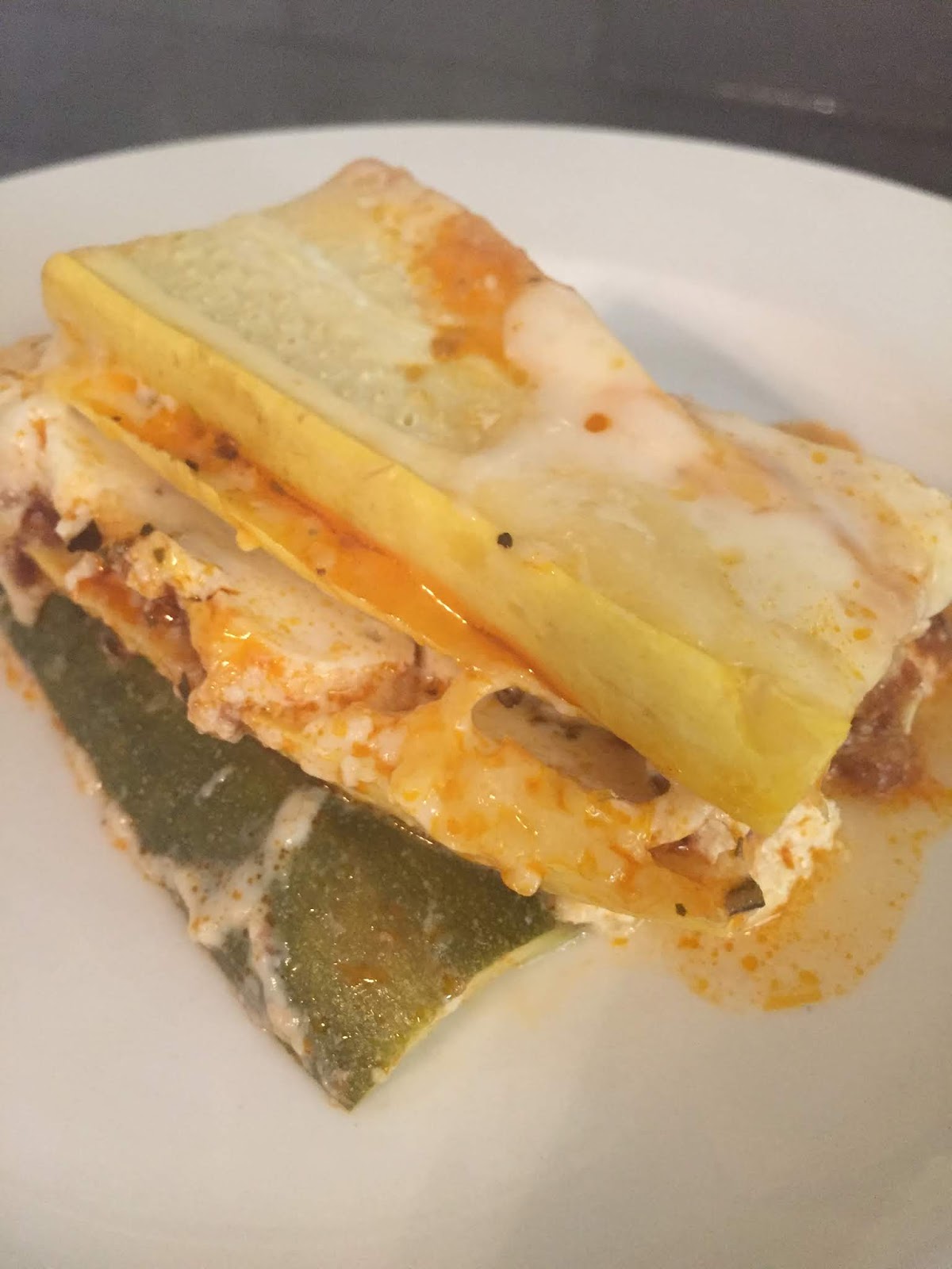 How does the recipe save your waistline? By using either zucchini or yellow squash versus noodle layers. Goodbye starchy noodles, hello tender and flavorful vegetables.