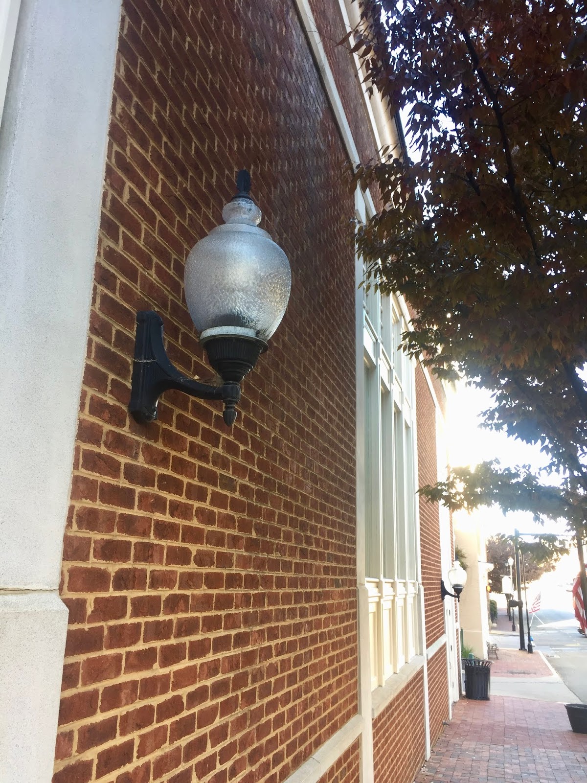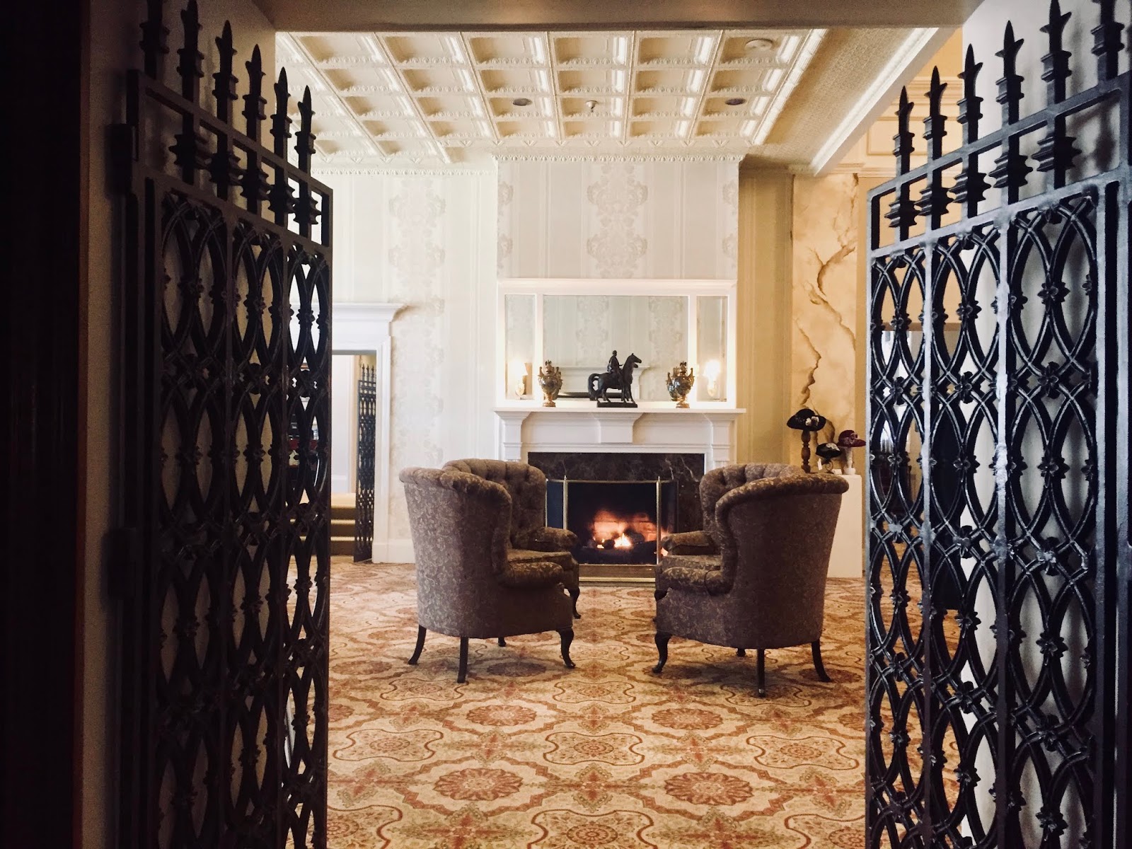 The General Morgan Inn is a delight to the eye: the stately ironwork, the coffered ceilings, the beautifully designed carpet, and, of course, the lamp lights.